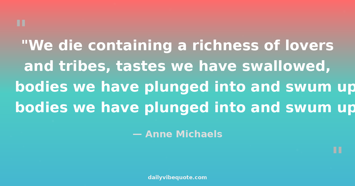 "We die containing a richness of lovers and tribes, tastes we have swallowed, bodies we have plunged into and swum up as if rivers of wisdom, characters we have climbed into as if trees, fears we have hidden in as if caves."