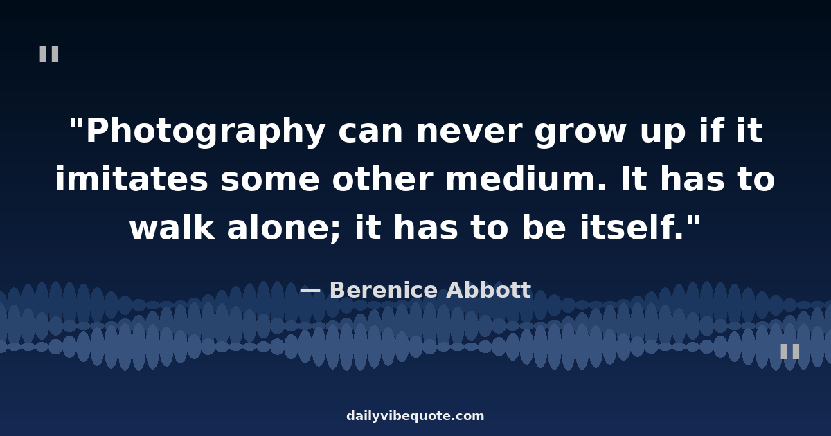 "Photography can never grow up if it imitates some other medium. It has to walk alone; it has to be itself."