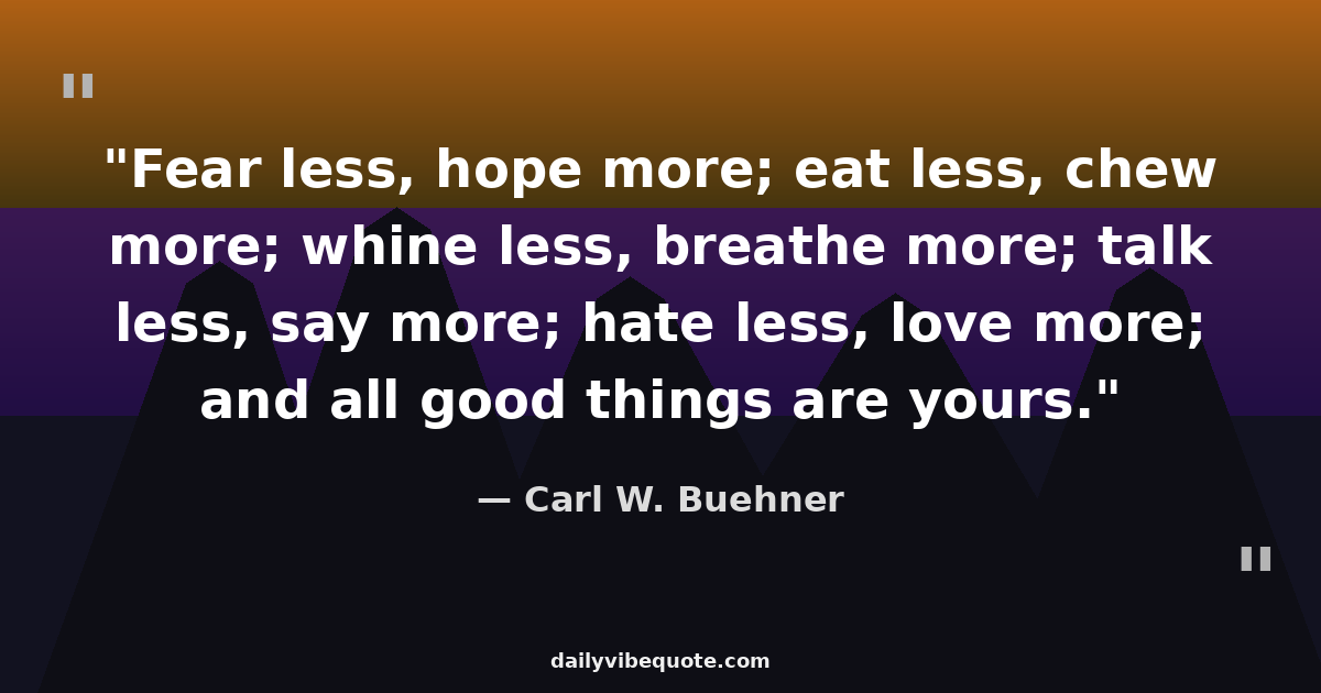 "Fear less, hope more; eat less, chew more; whine less, breathe more; talk less, say more; hate less, love more; and all good things are yours."