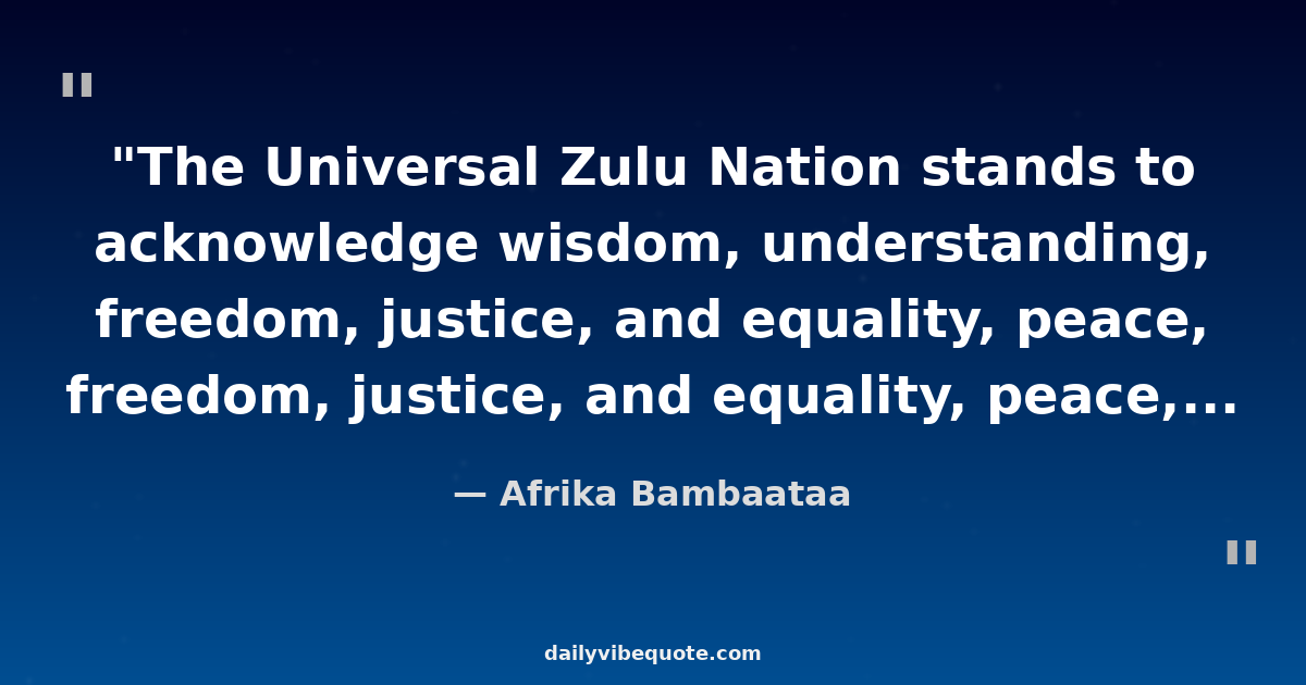 "The Universal Zulu Nation stands to acknowledge wisdom, understanding, freedom, justice, and equality, peace, unity, love, and having fun, work, overcoming the negative to the positive, science, mathematics, faith, facts, and the wonders of God."