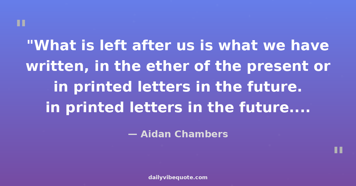 Aidan Chambers is a British author known for his works in young adult fiction. He started his career as a teacher before turning to writing. His novels often explore themes of adolescence, identity, and personal growth. Chambers' most famous work is the novel 'Dance on My Grave', which won the Carnegie Medal in 1990.