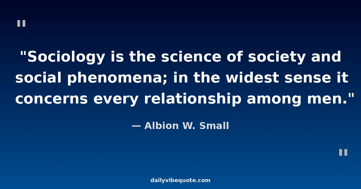 Albion W. Small (1854–1926) was an American sociologist who is often regarded as one of the founders of the academic discipline of sociology in the United States. He was a prominent figure in the Chicago School of Sociology and played a key role in shaping the development of sociology as a scientific field. Small was a prolific writer and educator, known for his work on the importance of social relationships and social institutions in understanding human behavior.