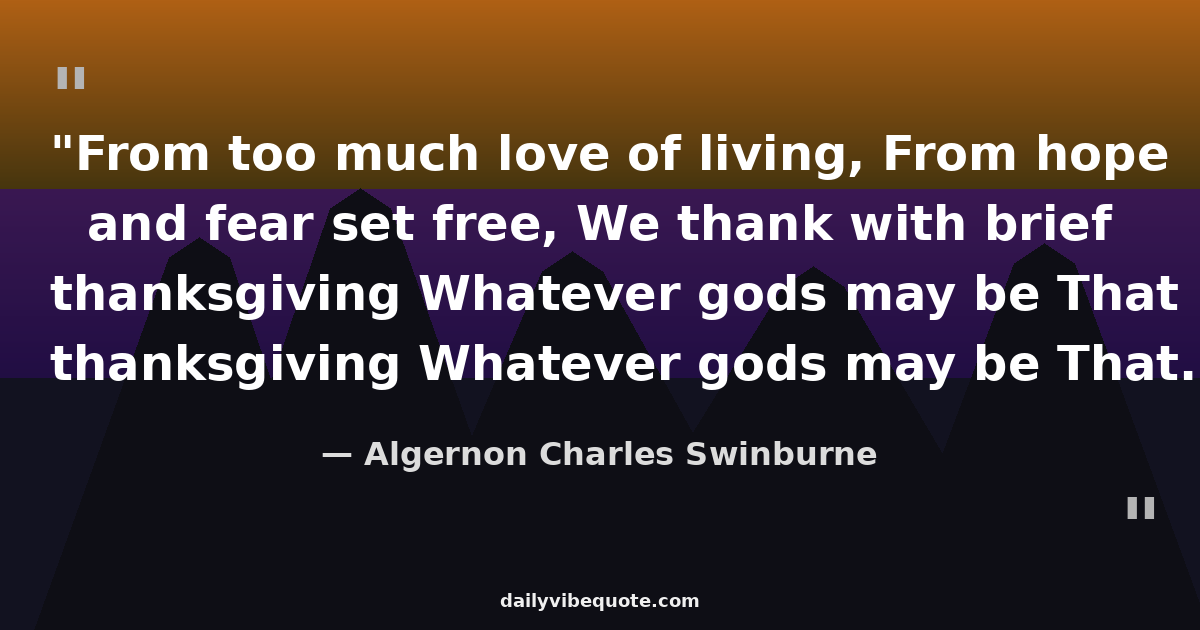 "From too much love of living, From hope and fear set free, We thank with brief thanksgiving Whatever gods may be That no life lives for ever; That dead men rise up never; That even the weariest river Winds somewhere safe to sea."